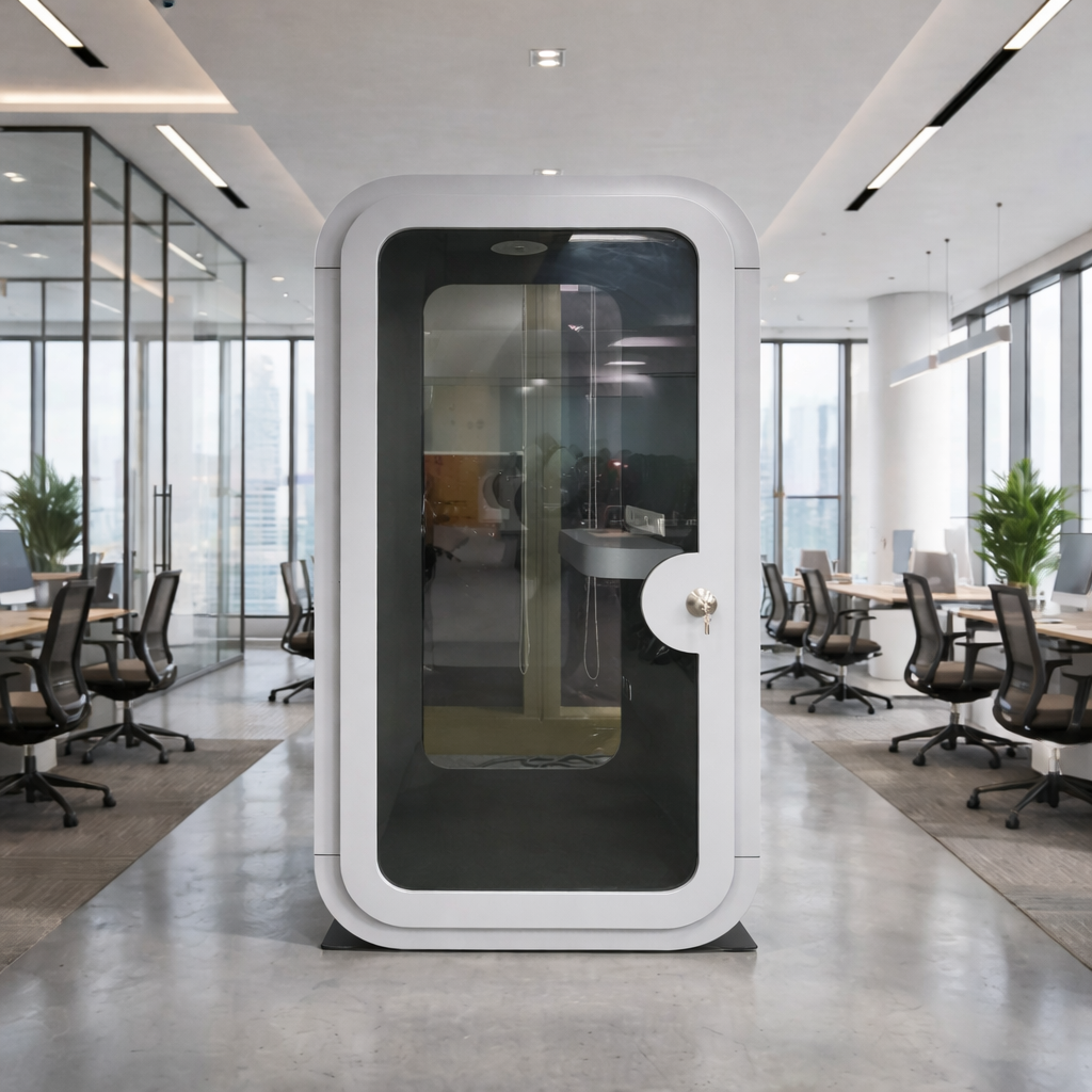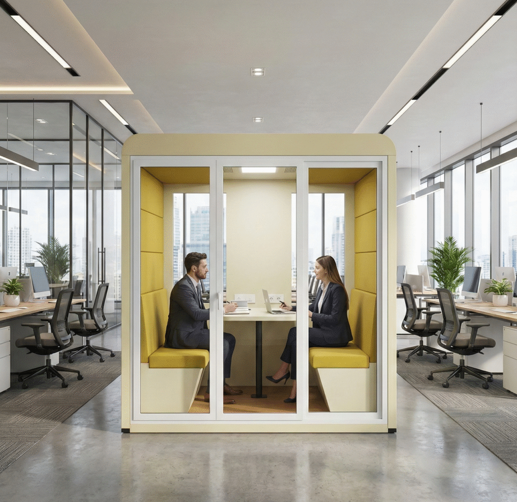 A phone booth for office is a compact, soundproof phone booth for office use. It helps teams take calls, video meetings, and focused work sessions without noise disturbance. These booths improve privacy, boost productivity, and support modern office design ideas for companies shifting to hybrid work solutions.
