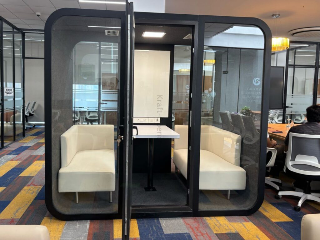 A meeting pod is a sound-controlled space for small group discussions. Comes in sizes like 2 person meeting pod and 4-person pods.