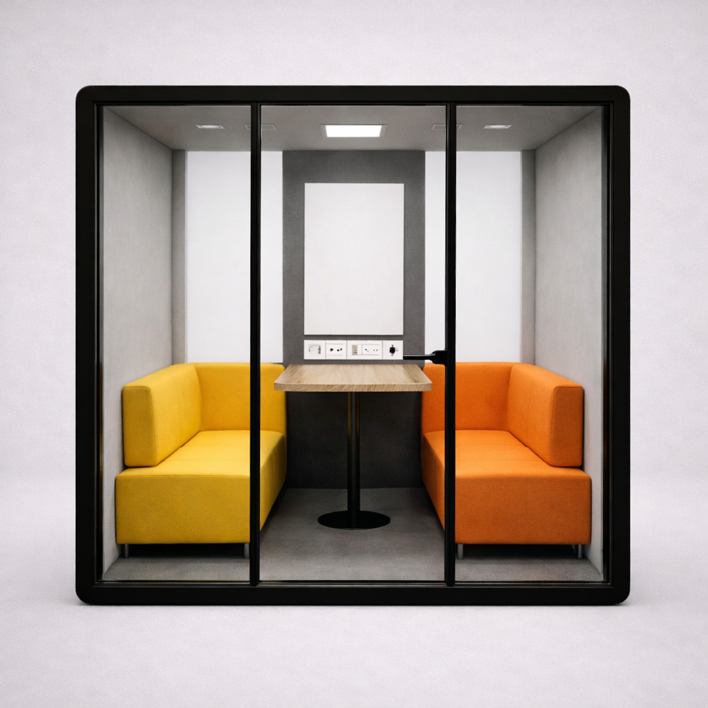A meeting pod is a sound-controlled space for small group discussions. Perfect for team sync-ups in an office meeting pod or private meetings in an office meeting booth.
